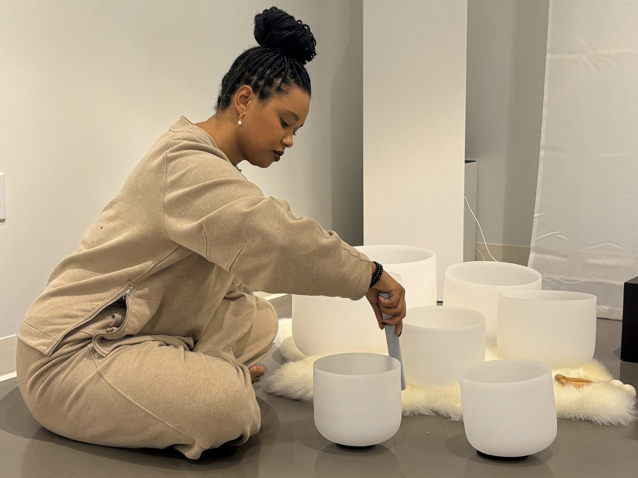 When designing the space for her first yoga studio, Jasmine RaShae’ was intentional with every detail. Ancient African artifacts line the studio walls and there’s an inviting lounge area at the front, complete with a record player open for anyone to use. RaShae’ jokes that people walking by may question if it’s yoga studio or an art gallery.