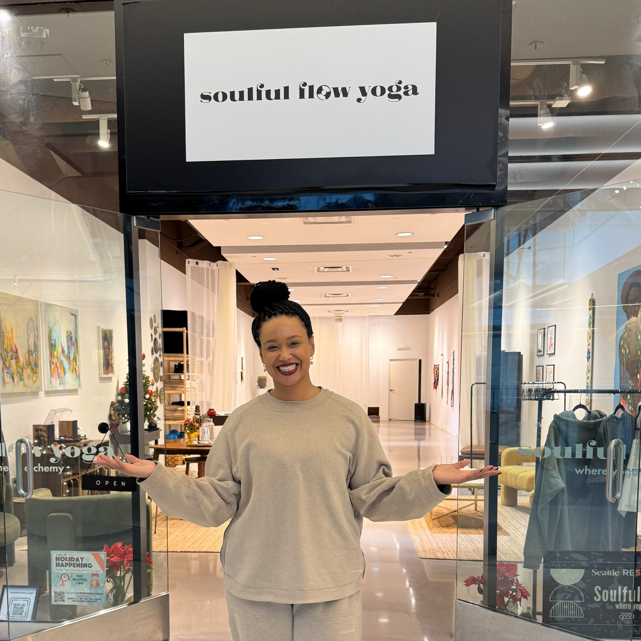 RaShae’s studio, Soulful Flow Yoga, is located inside the Pacific Place shopping center. Her studio is one of the first pop-ups our Seattle Restored program opened in the Downtown shopping mall in late 2025. As part of our work to open up economic opportunities, our Seattle Restored program pairs small business owners with vacant commercial spaces for pop-up activations. This allows entrepreneurs to access affordable spaces while trying out their business model.